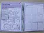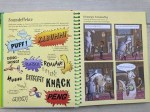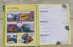 Fazit: Ein nettes Buch rund um das eigene Gestalten von Comics. Konkrete Tipps zum Zeichnen werden eher weniger gegeben, es wird vorausgesetzt, dass man das schon irgendwie kann – oder einfach Strichmännchen/ -frauchen malt. Der Schwerpunkt lieg eher darauf, worum es in einem Comic gehen könnte, was zu einem Comic gehört und Impulse für eigene Ideen zu liefern. Meine Schwester hat dieses Buch zu ihrem neunten Geburtstag von einem Freund geschenkt bekommen und darin auch bereits einige Seiten ausgefüllt (auf manchen Fotos zu sehen). Es gefällt ihr gut. Die Texte sind einfach zu verstehen, das Buch ist ziemlich bunt und es macht Spaß, es anzugucken. Es enthält auch eine ganze Reihe von kleinen Comicseiten, die Lust aufs selbst aktiv werden machen (sollen). Mit den beigelegten Stickern (Sprechblasen, Herzen, Bomben, Totenkopf, Kugelaugen u.a.) lassen sich die eigenen Werke dann noch ergänzen oder verzieren.